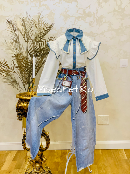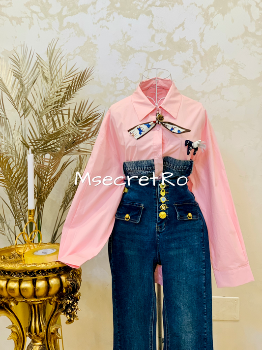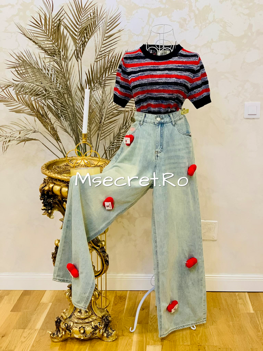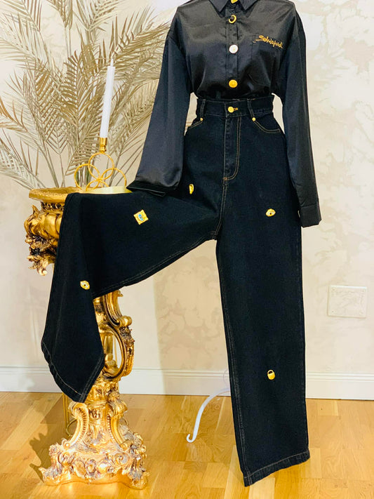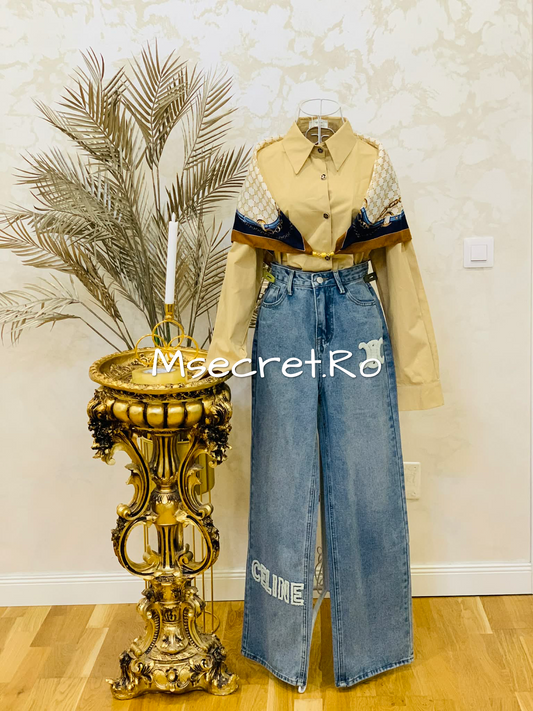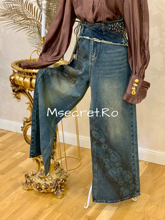 Blugi evazati cu modele aurii si talie inalta