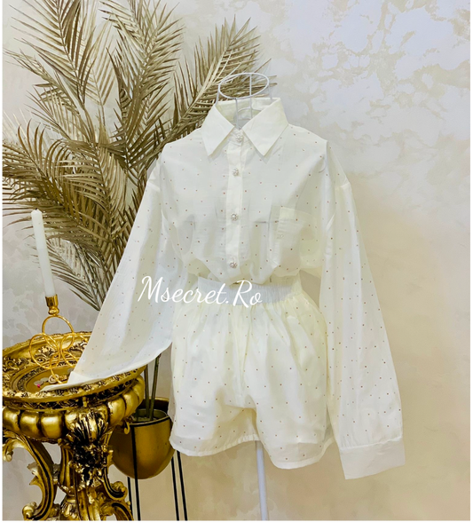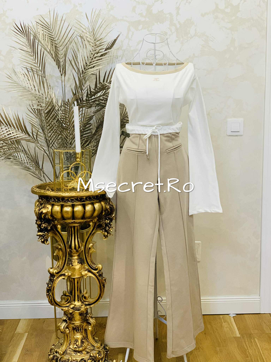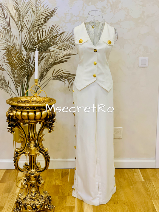 Compleu din denim alb cu vestă și pantaloni largi, nasturi aurii