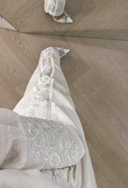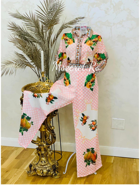 Compleu roz format din pantaloni si camasa cu perle si broderie