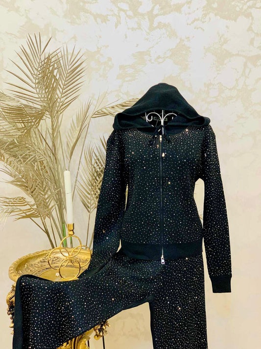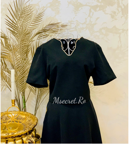 Costum format din sacou cu guler sal, cu pietre si pantaloni evazati