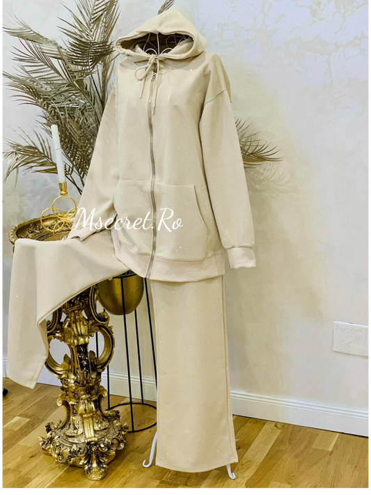 Compleu maro din bumbac cu pantaloni lungi si hanorac