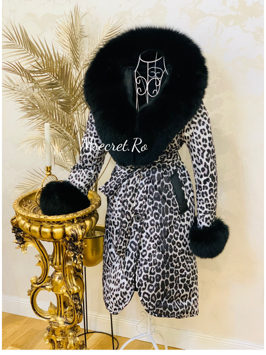 Geaca lunga animal print cu gluga, guler de blana naturala