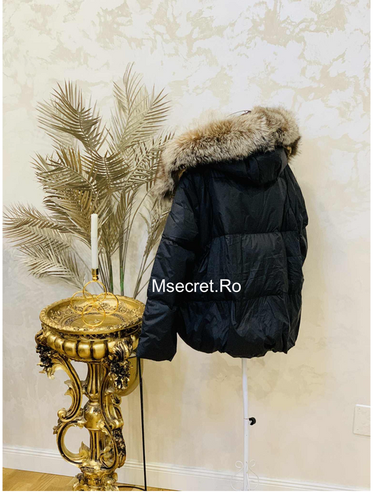 Geaca neagra cu guler de blana de vulpe umpluta cu puf