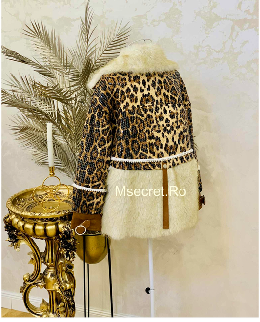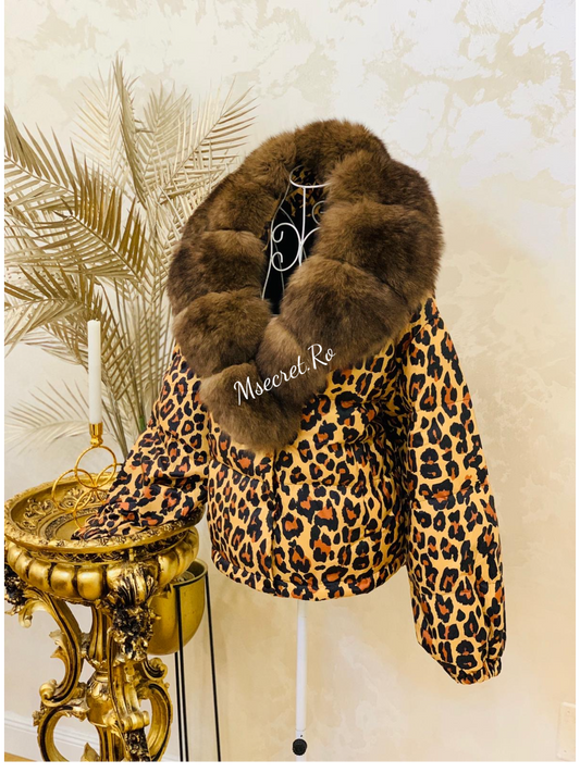 Geaca print cu guler de blana naturala si umpluta cu puf