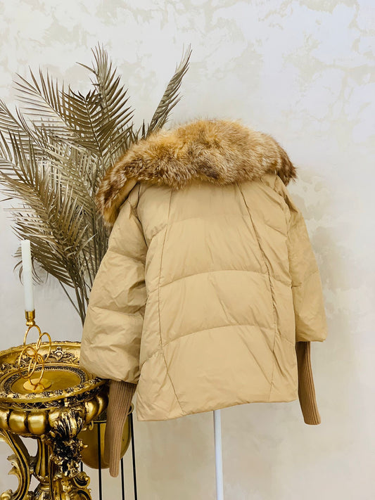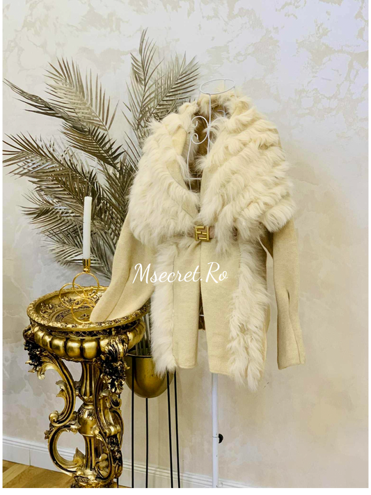 Geaca crem cu guler de blana de vulpe umpluta cu puf
