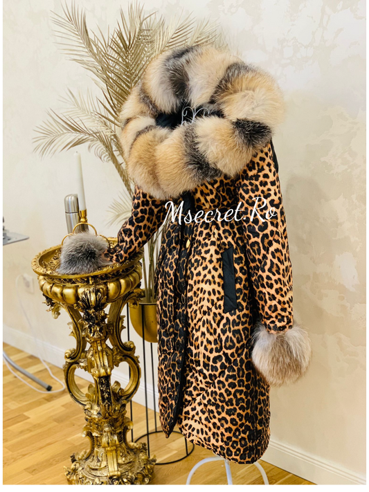 Geaca lunga animal print cu guler de blana naturala