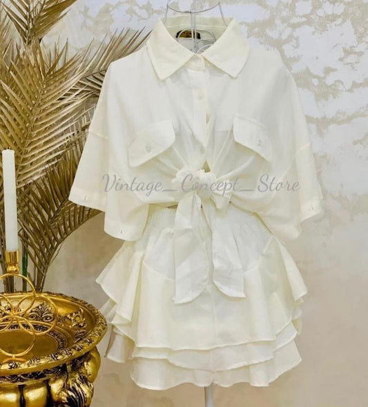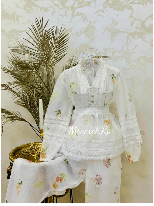Compleu alb din in format din camsa si fusta pantalon