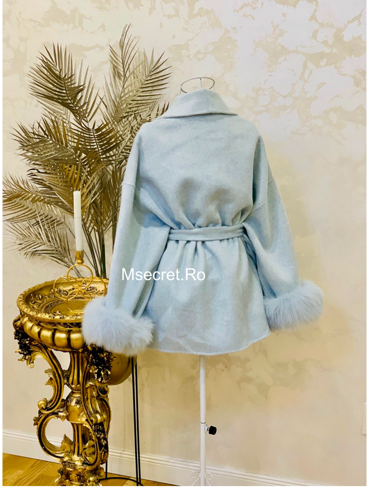 Palton baby blue scurt din lână cu manșete din blana naturala