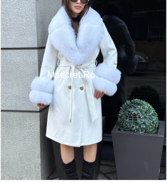 Palton alb elegant cu guler și manșete din blana