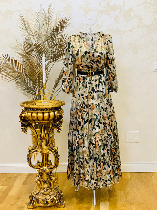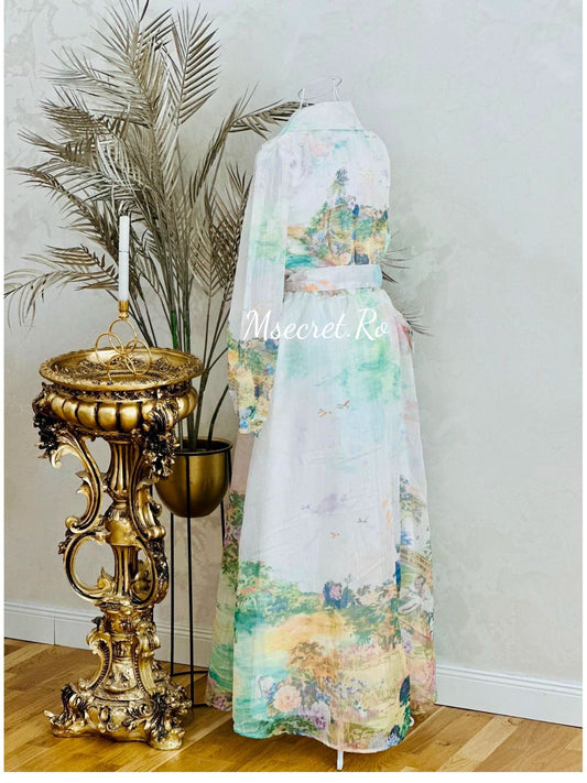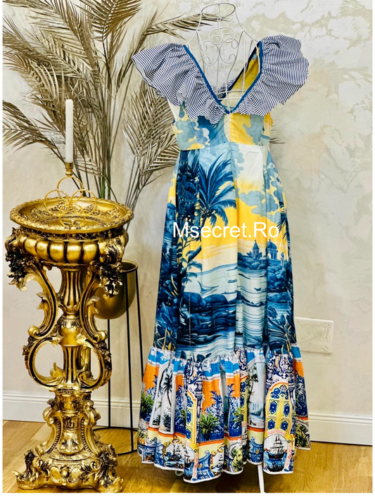 Rochie maxi cu imprimeu marin și fundă supradimensionată