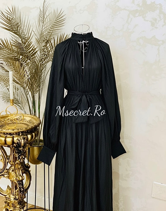 Rochie neagra lunga satinat cu guler înalt și mâneci ample