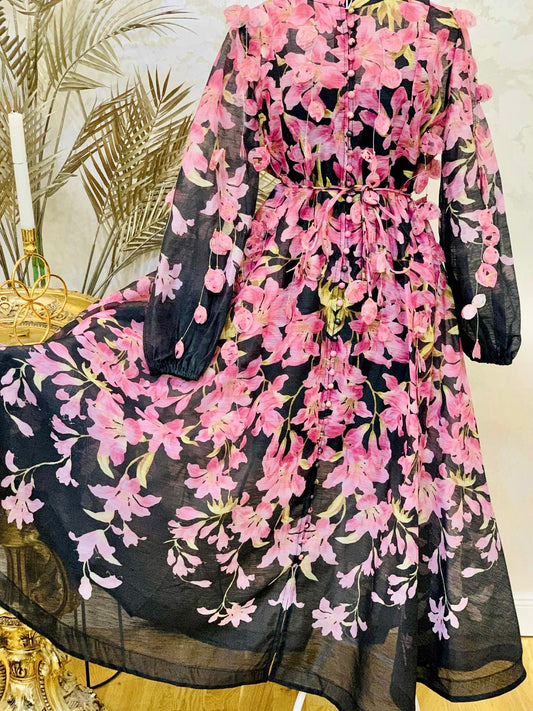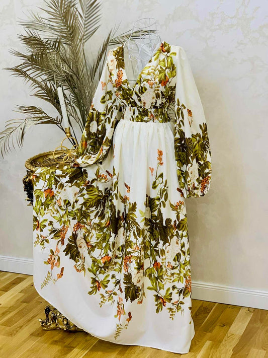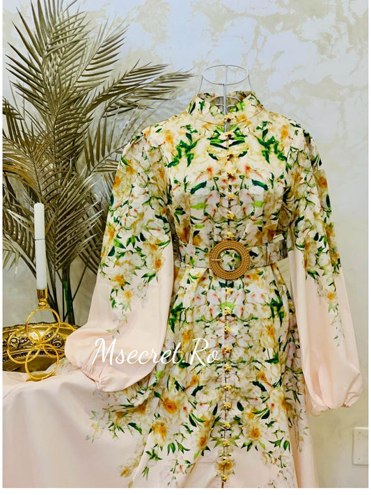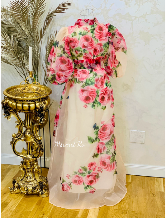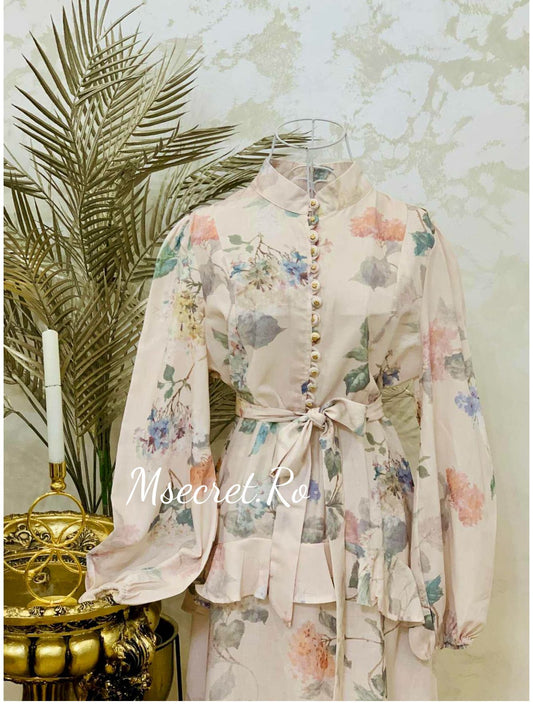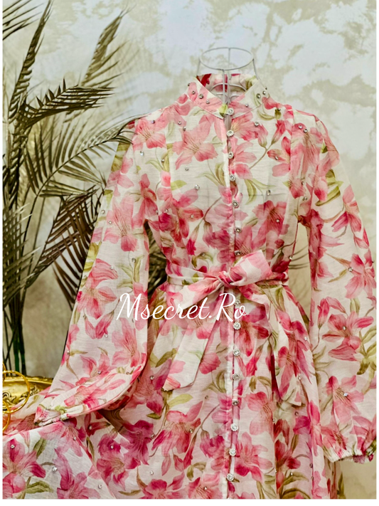 Rochie lunga pastel cu imprimeu floral și nasturi decorativi
