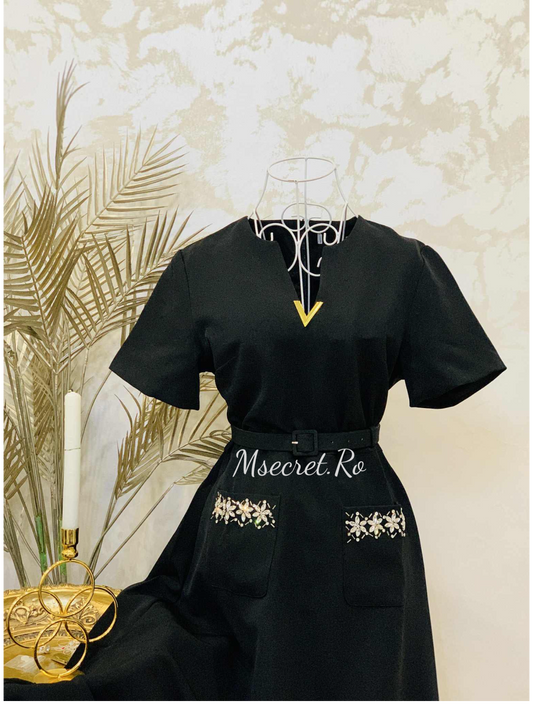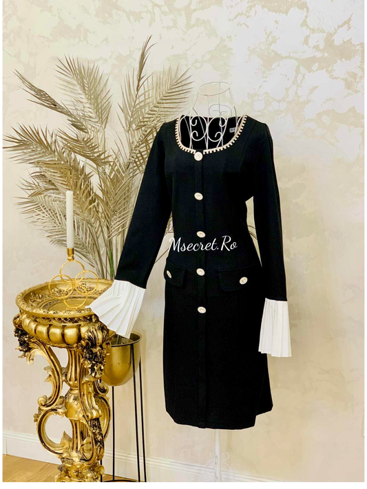 Rochie neagra elegantă cu nasturi bijuterie și manșete plisate
