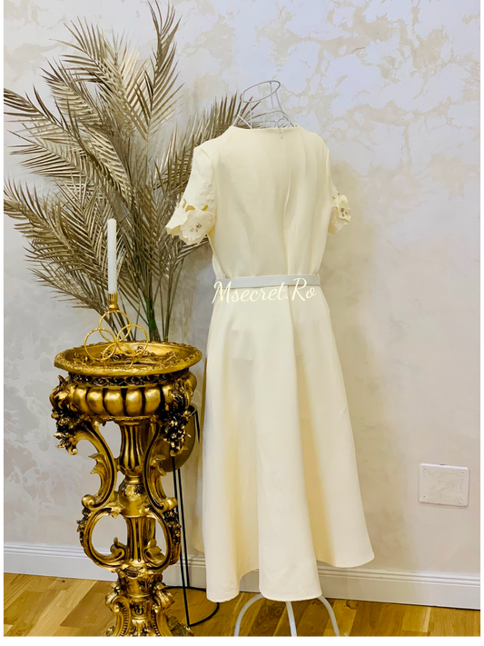 Rochie crem mici cu aplicatii si curea, maneca scurta