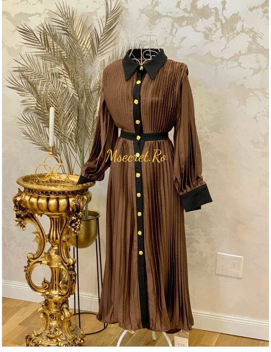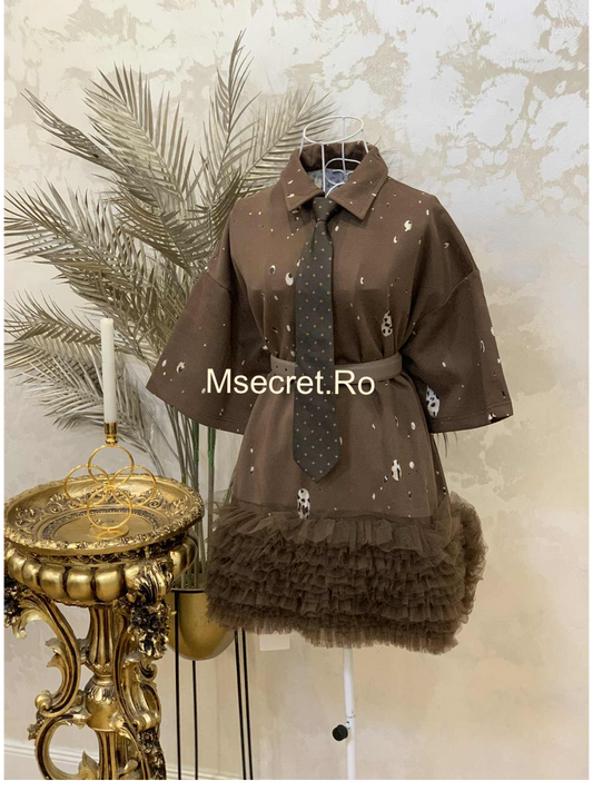 Rochie maro din bumbac cu cravata și fusta din volane de tulle