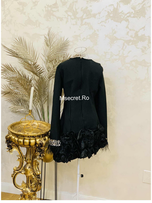 Rochie neagră scurtă cu pene și volane satinate