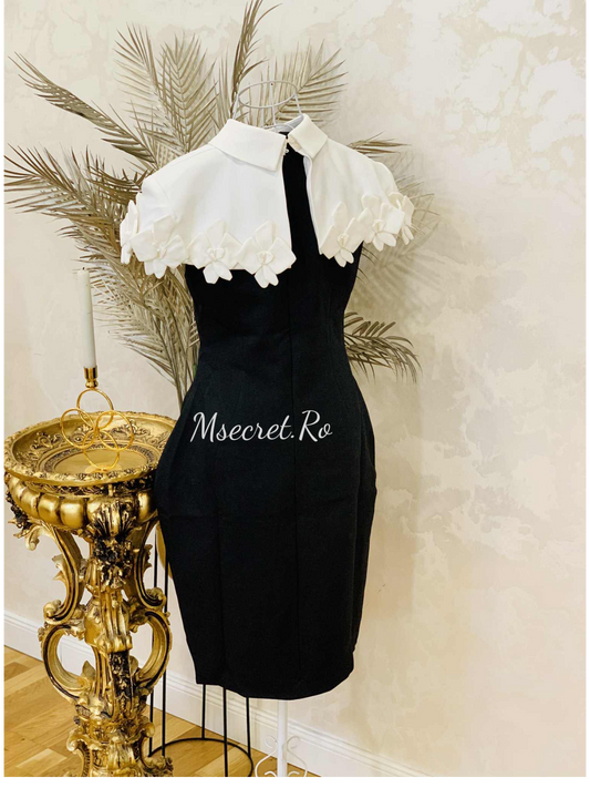 Rochie neagra creion cu guler alb și capelet detașabil cu funde