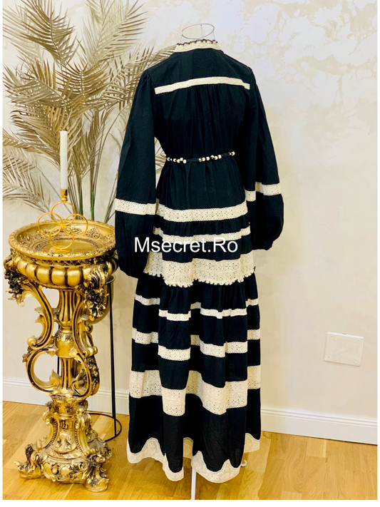 Rochie lunga neagră cu dantelă crem și mâneci bufante