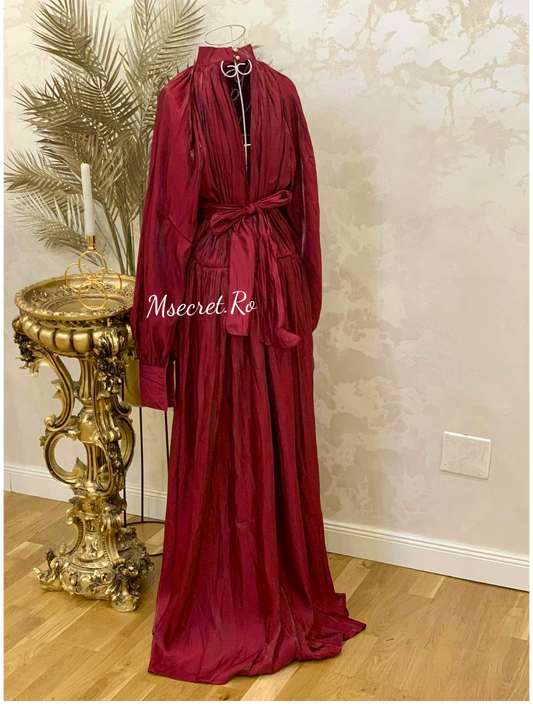Rochie burgundy lunga satinat cu guler înalt și mâneci ample