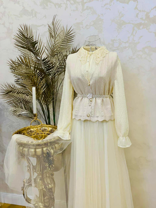 Rochie ivory cu vesta tricotată și curea cu perle