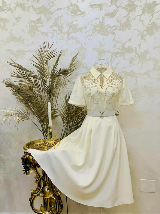 Rochie crem mici cu aplicatii si curea, maneca scurta