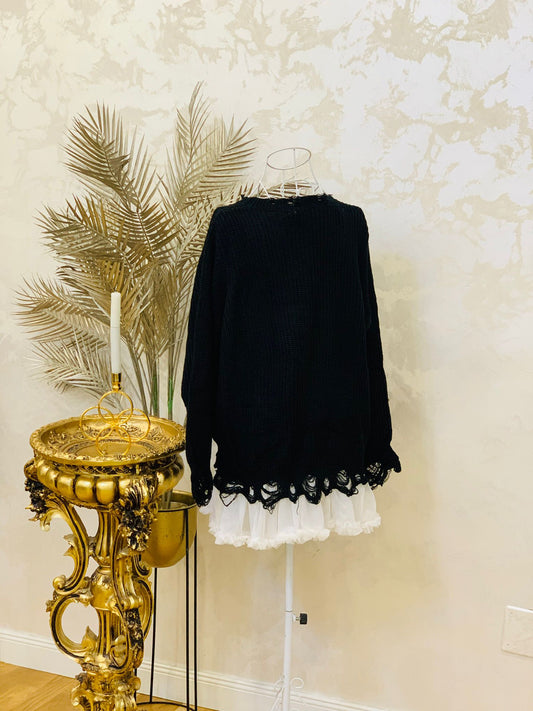 Rochie neagră tricotată cu detalii dantelă și accesorii metalice