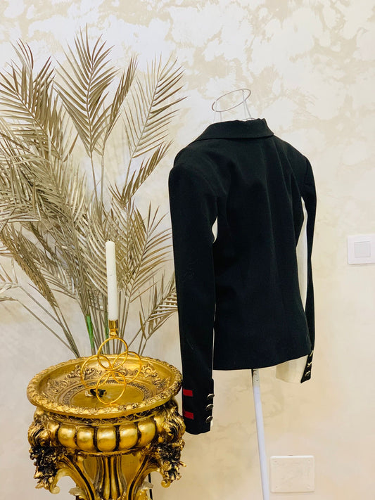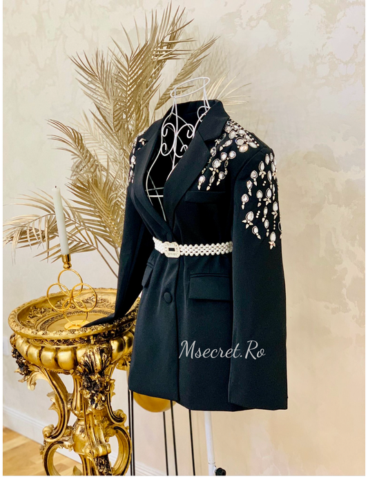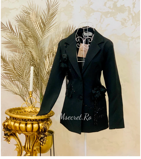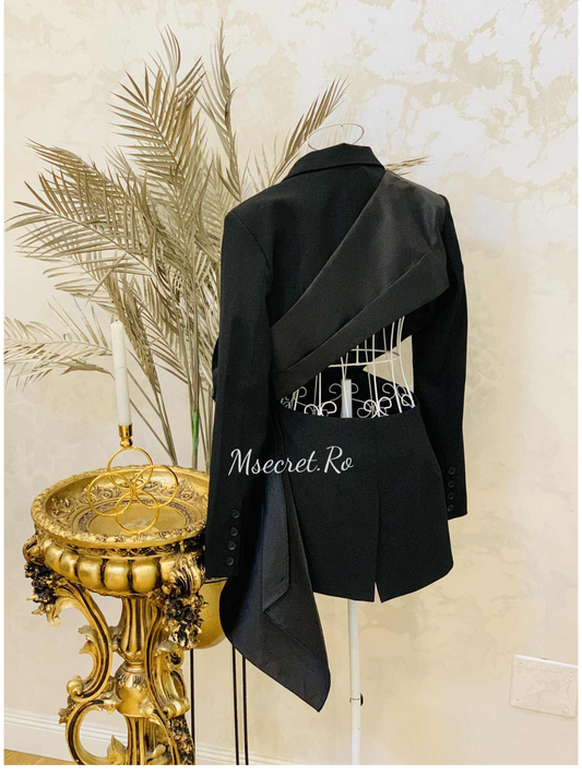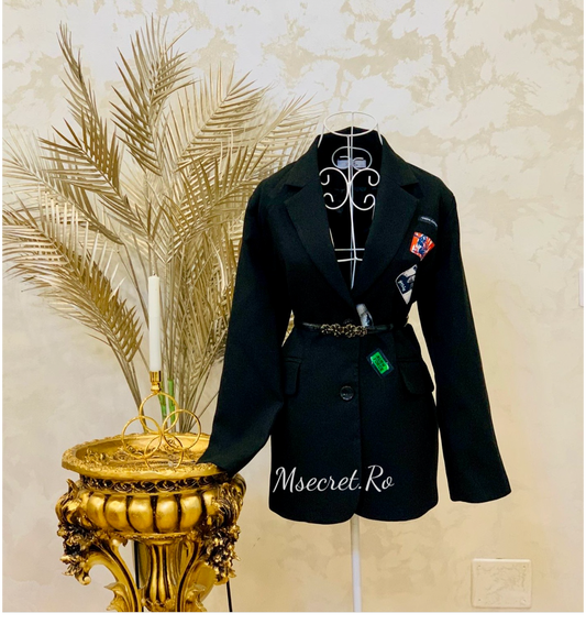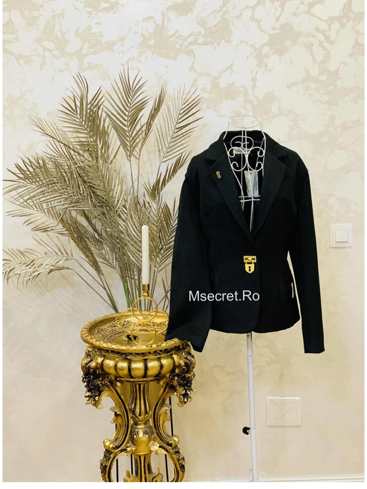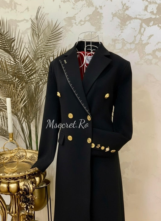 Palton negru elegant cu nasturi aurii, croială tip sacou