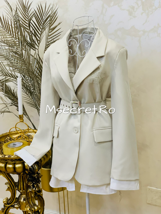 Costum elegant crem cu sacou cu volane