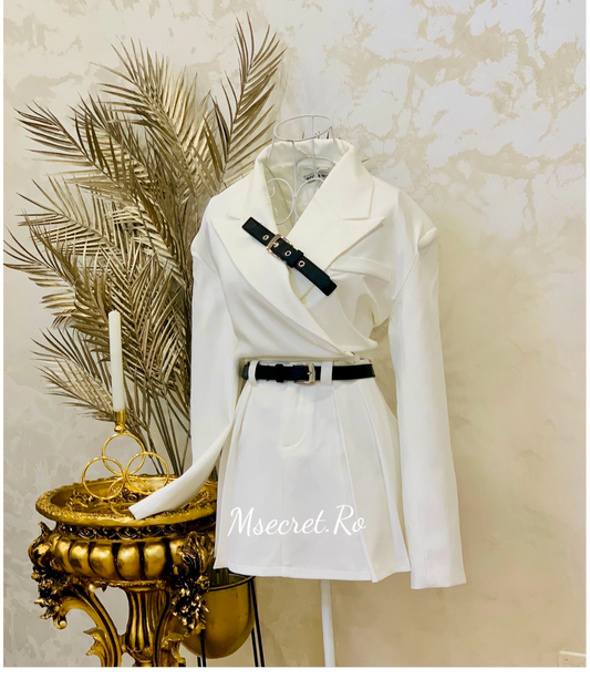 Compleu alb format din sacou si fusta plisata cu curea