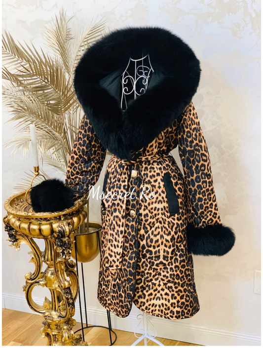 Geaca lunga animal print cu gluga, guler de blana naturala