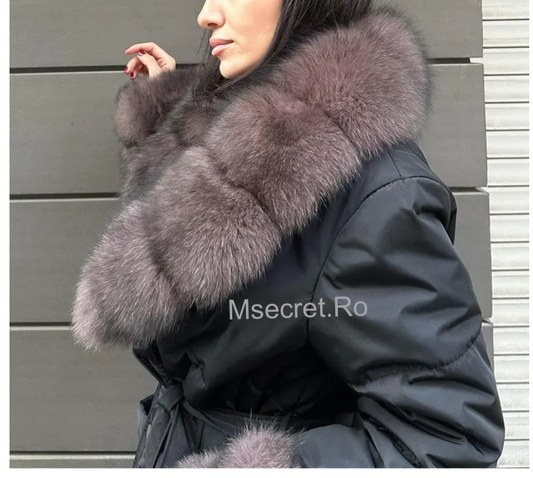 Geaca lunga animal print cu gluga, guler de blana naturala