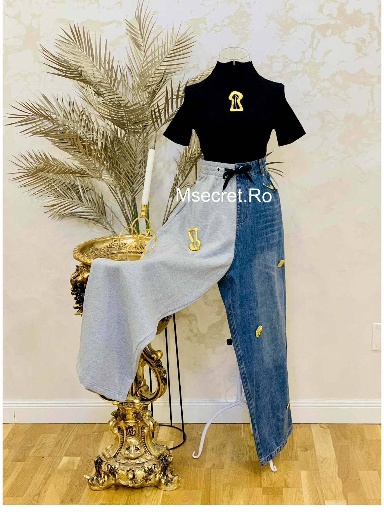 Blugi spectaculoși, realizați dintr-un mix creativ de denim albastru și tricot gri, combinați într-un design asimetric modern. Aplicațiile brodate aurii oferă o notă luxuriantă și exclusivistă, iar talia cu șnur reglabil adaugă confort și versatilitate.