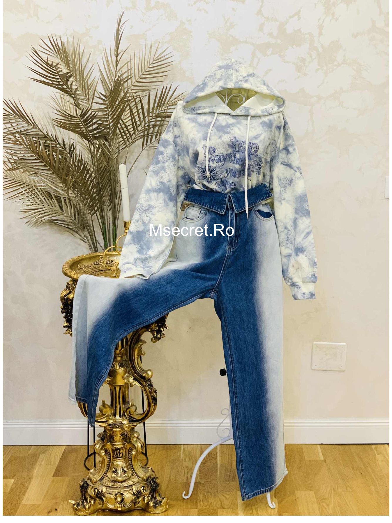 - • Efect decolorat (ombre wash): Trecerea de la albastru închis la albastru deschis creează un contrast vizual interesant.