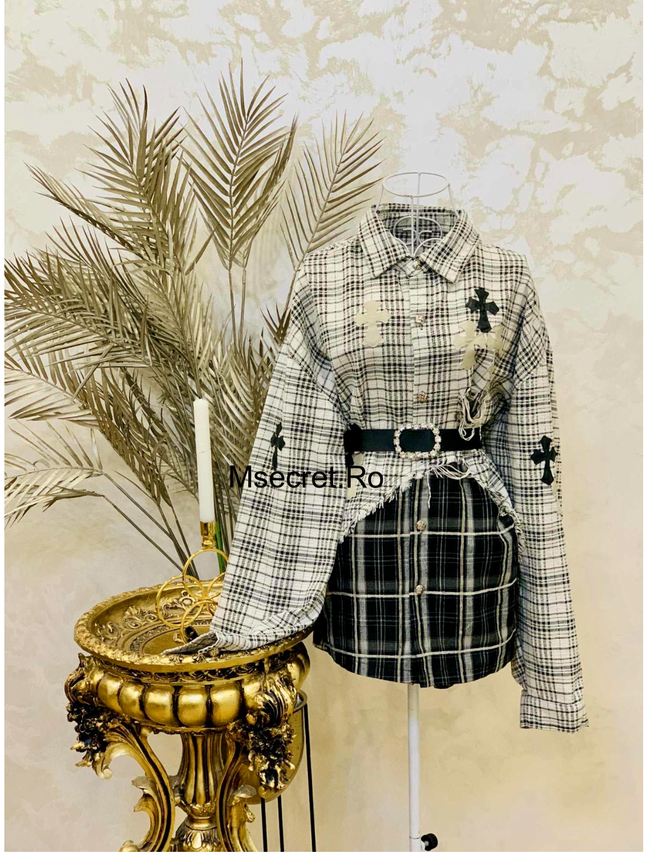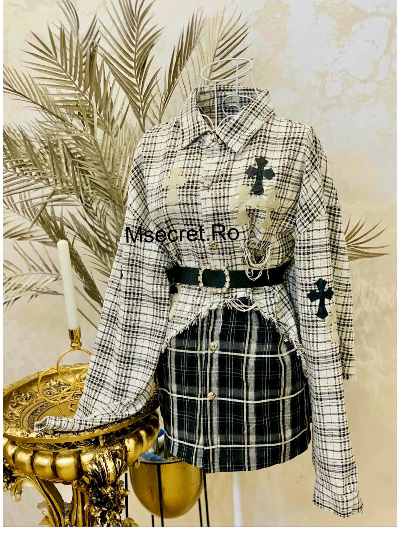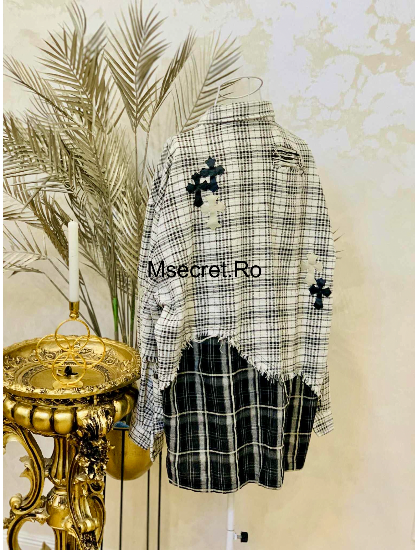 Decorată cu aplicații tip cross în nuanțe contrastante și cu detalii inspirate din patchwork, această piesă se remarcă prin stilul său edgy. Poate fi purtată ca rochie scurtă sau cămașă oversized, cu sau fără centură, în funcție de preferințe.