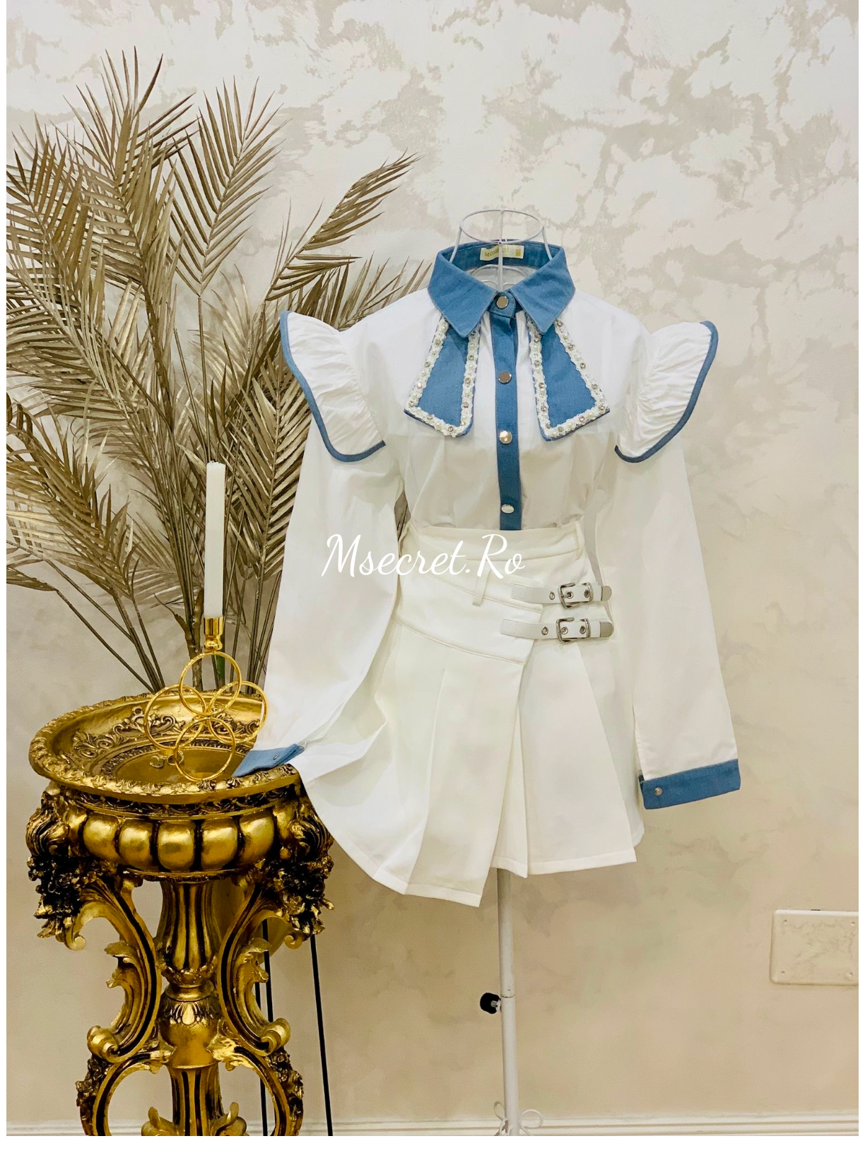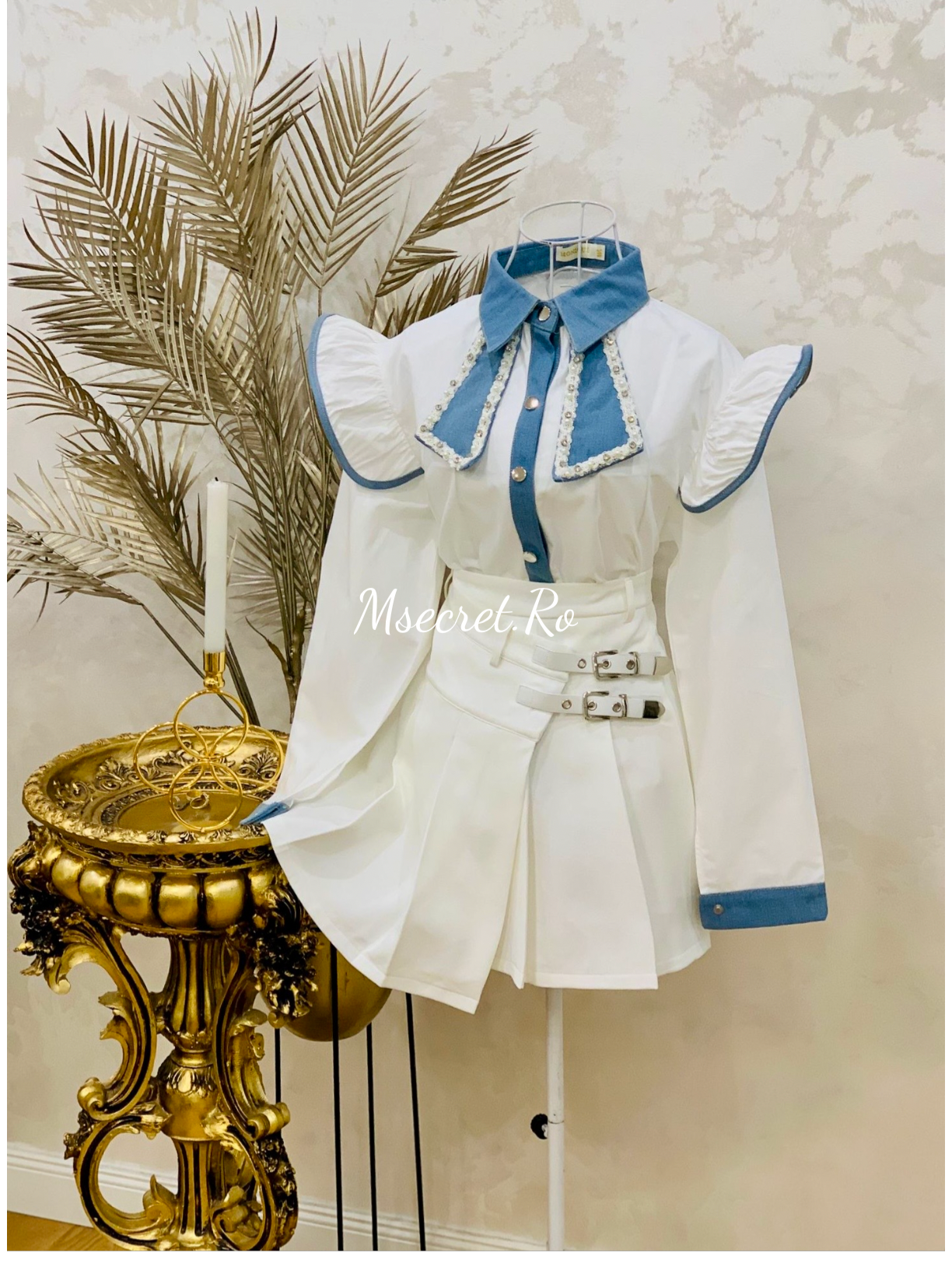 ✔ Design: Camasă cu detalii elegante și fustă plisată structurată