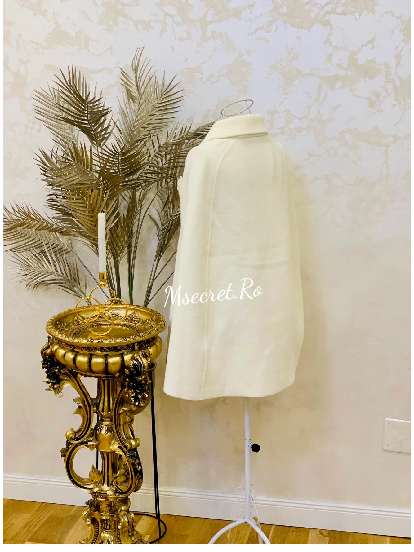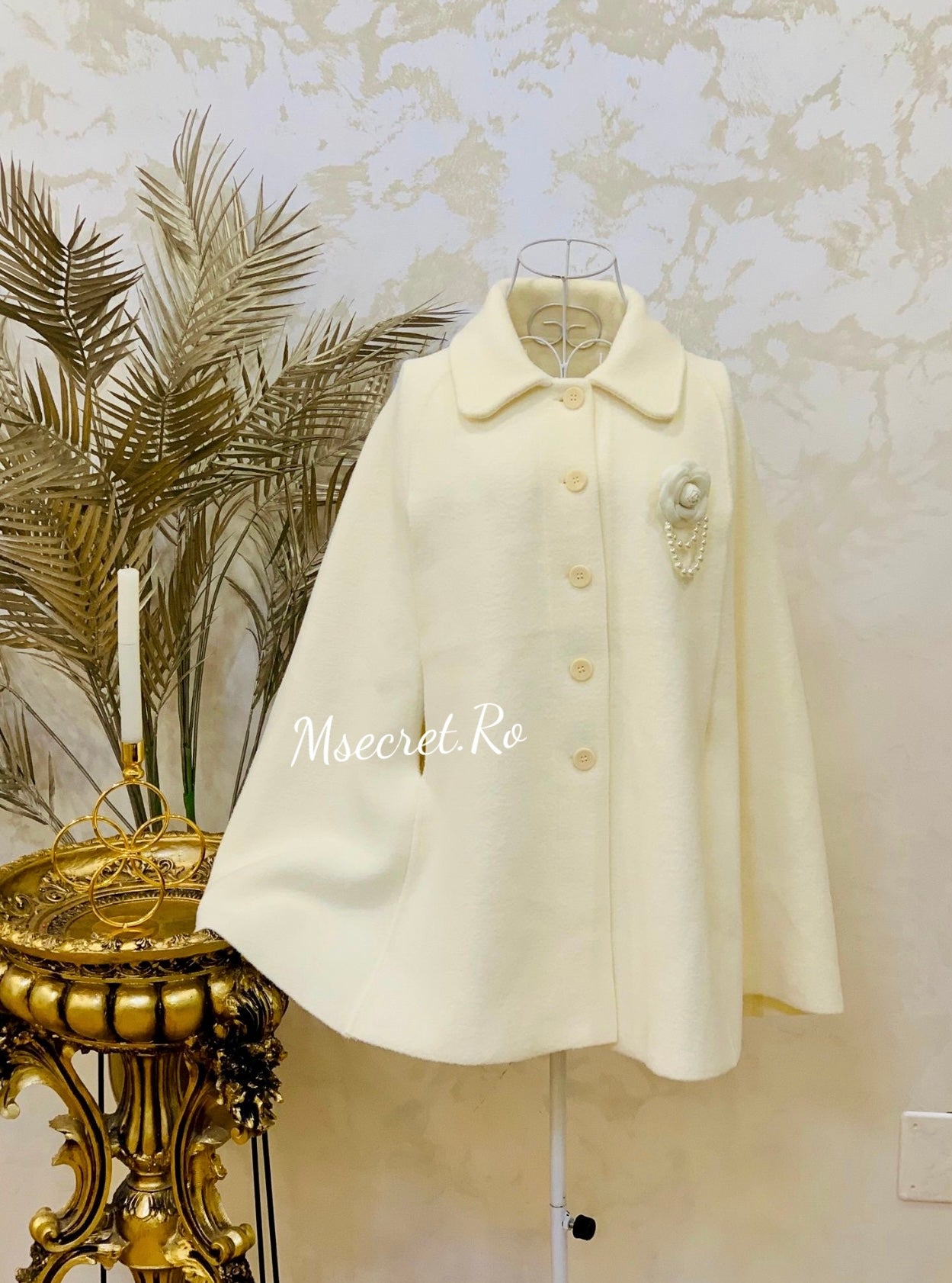 Capă rafinată într-o nuanță de alb elegant, ideală pentru ținute deosebite. Are un croi lejer și feminin, închisă cu nasturi frontali și accesorizată cu o floare decorativă cu perle. Perfectă pentru un look sofisticat și romantic în sezonul rece.