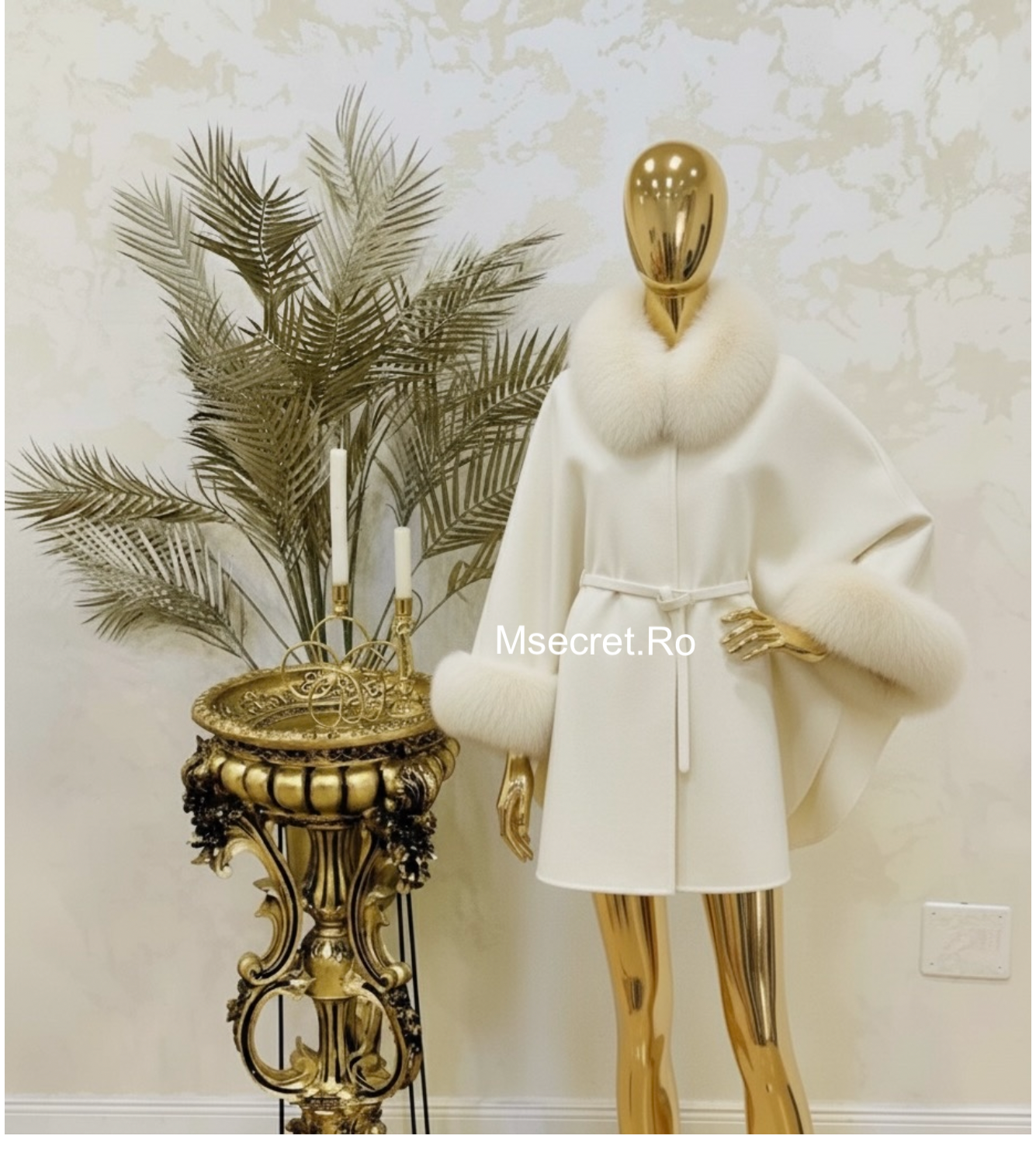 Capă sofisticată confecționată din lână de calitate premium, moale și călduroasă, completată de blană naturală luxuriantă de vulpe la guler și manșete, detasabila. Croiala amplă și fluidă conferă o siluetă elegantă și rafinată, potrivită pentru orice tip de ținută de sezon rece.Are buzunare.