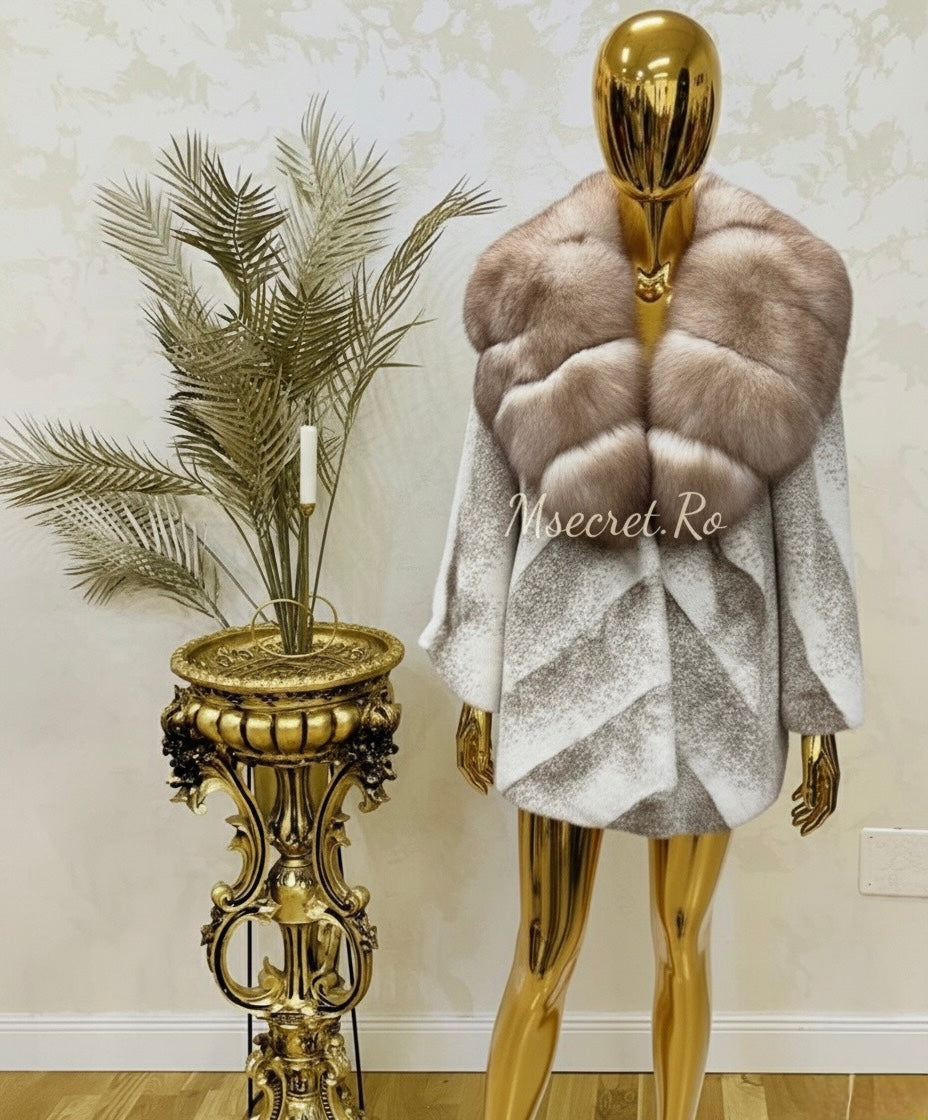 Capă rafinată din alcantară moale, cu croi amplu și cordon în talie, ce pune în valoare silueta. Gulerul din blană naturala de vulpe adaugă o notă luxoasă și sofisticată.