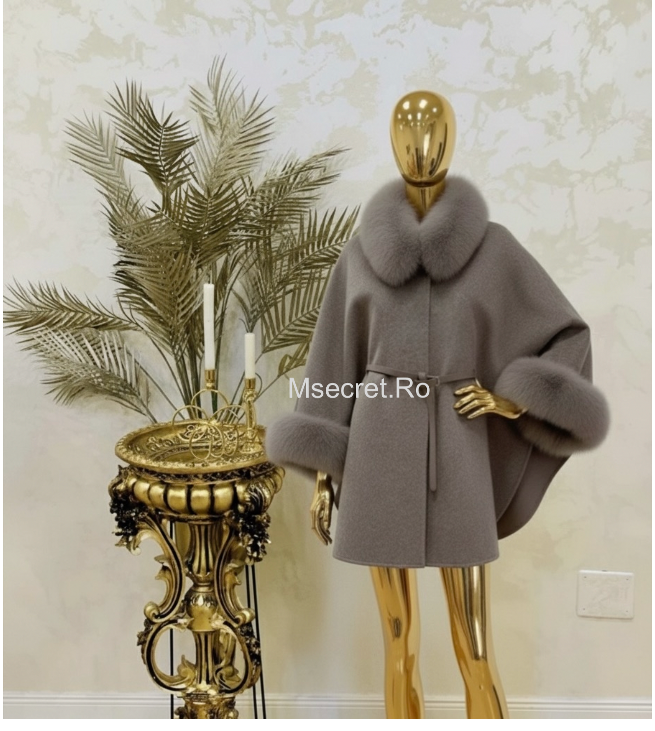Capă sofisticată confecționată din lână de calitate premium, moale și călduroasă, completată de blană naturală luxuriantă de vulpe la guler și manșete, detasabila. Croiala amplă și fluidă conferă o siluetă elegantă și rafinată, potrivită pentru orice tip de ținută de sezon rece.Are buzunare.