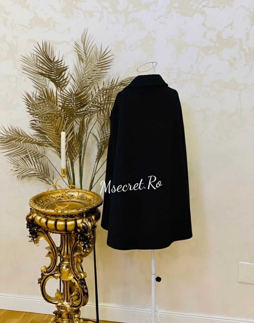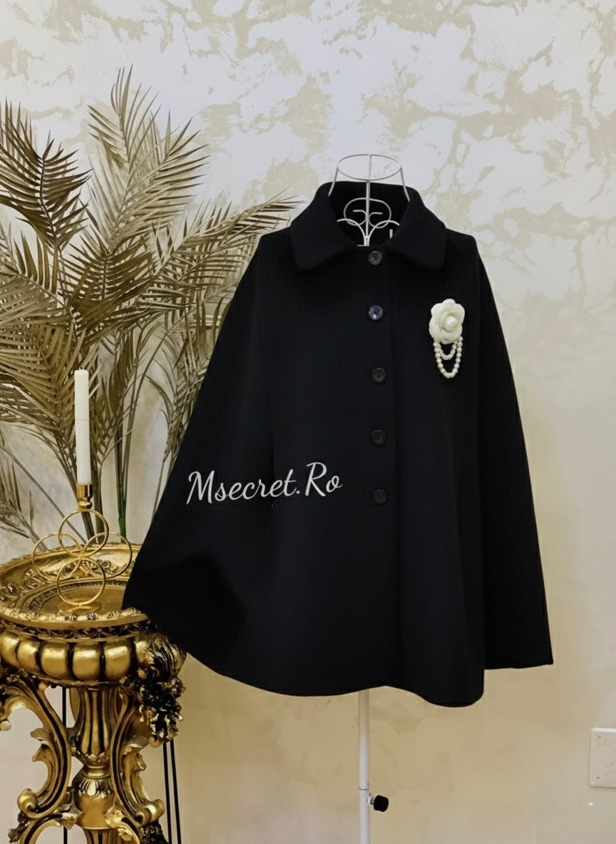 Capă rafinată într-o nuanță de alb elegant, ideală pentru ținute deosebite. Are un croi lejer și feminin, închisă cu nasturi frontali și accesorizată cu o floare decorativă cu perle. Perfectă pentru un look sofisticat și romantic în sezonul rece.