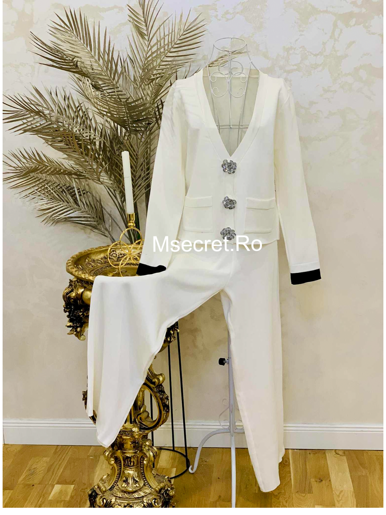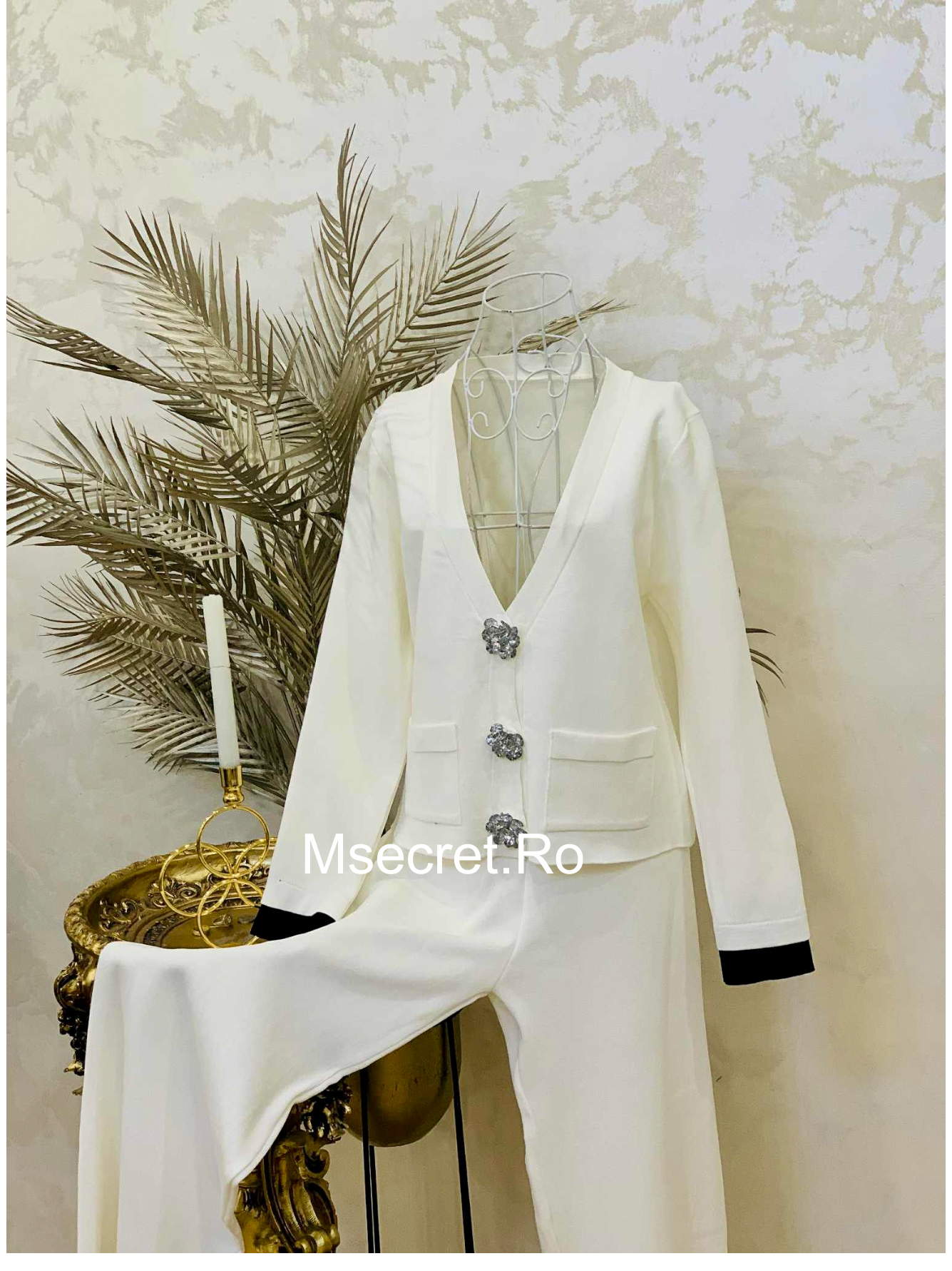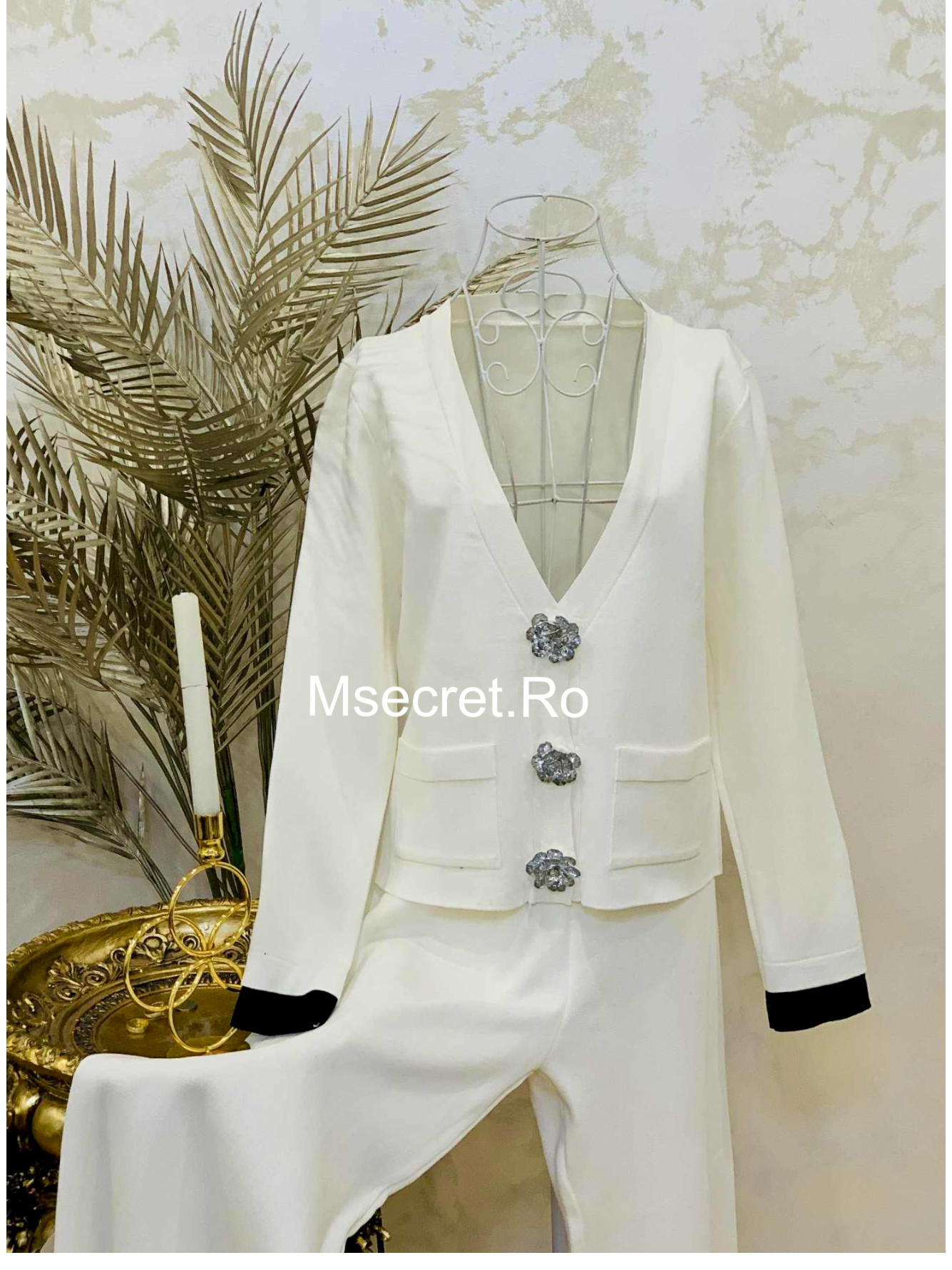 Sacoul are un croi modern, accentuat de nasturi tip floare cu aplicații strălucitoare și buzunare decorative, iar pantalonii lungi completează perfect ținuta, oferind un aer sofisticat și feminin.