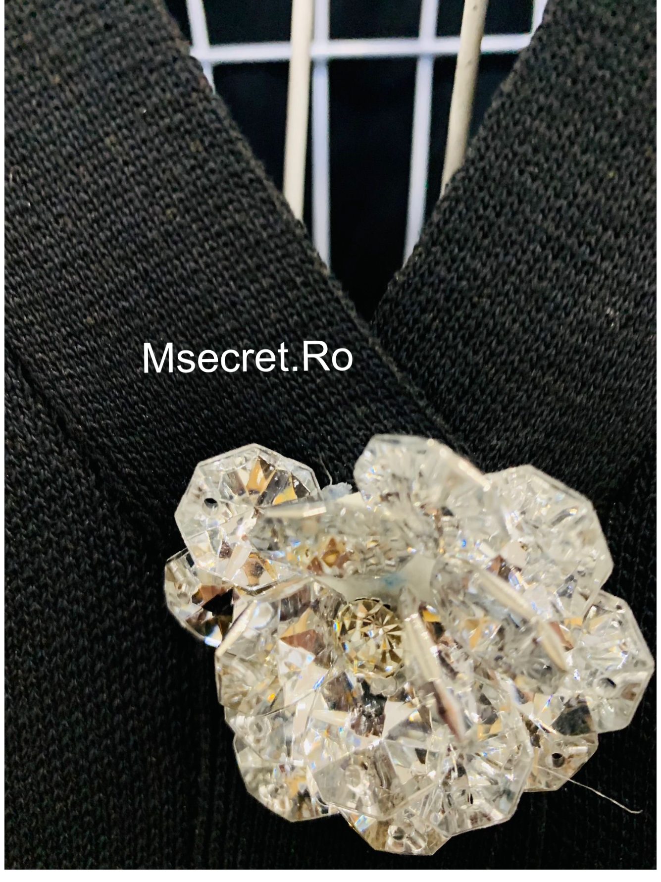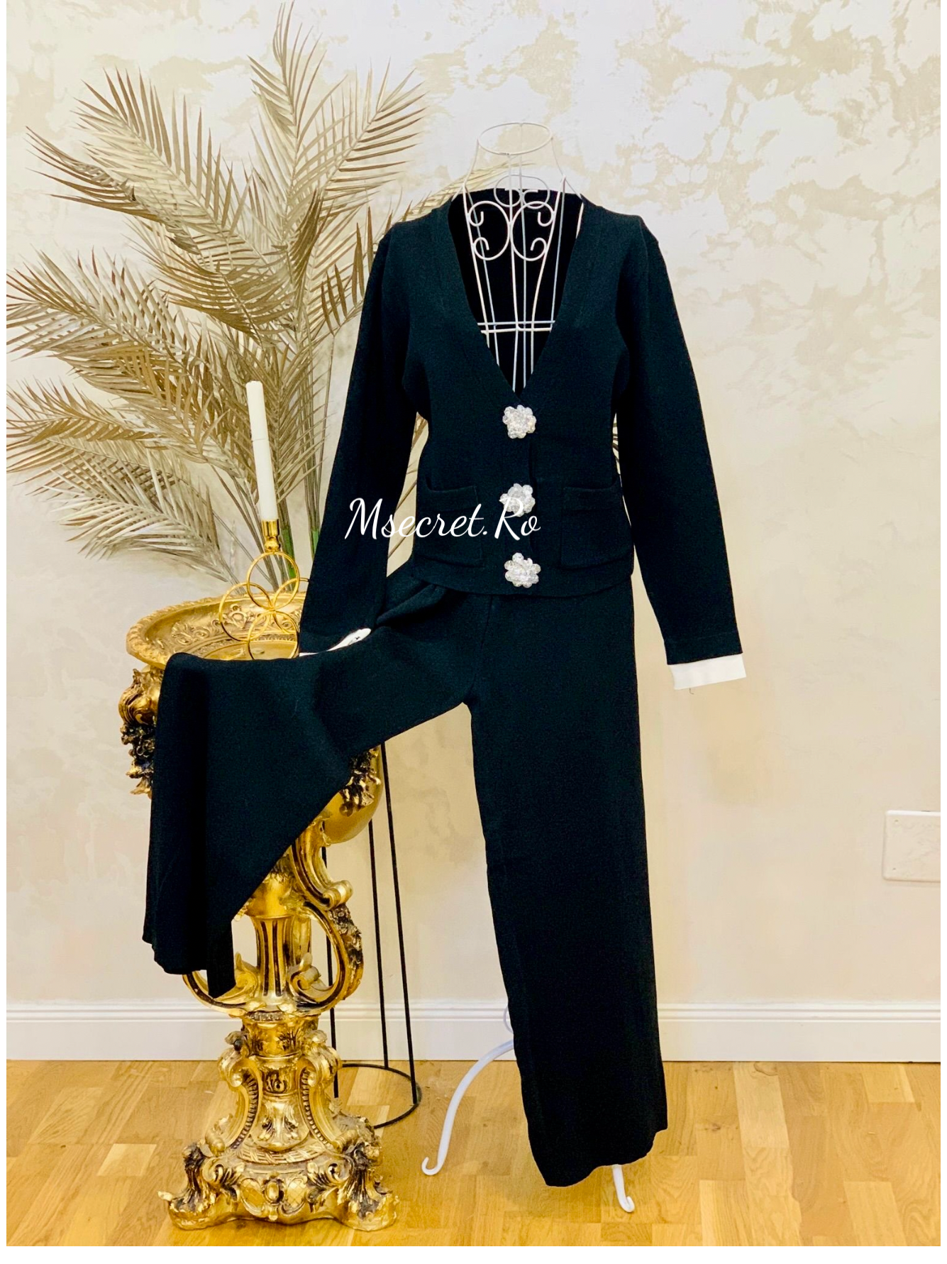 Sacoul are un croi modern, accentuat de nasturi tip floare cu aplicații strălucitoare și buzunare decorative, iar pantalonii lungi completează perfect ținuta, oferind un aer sofisticat și feminin.