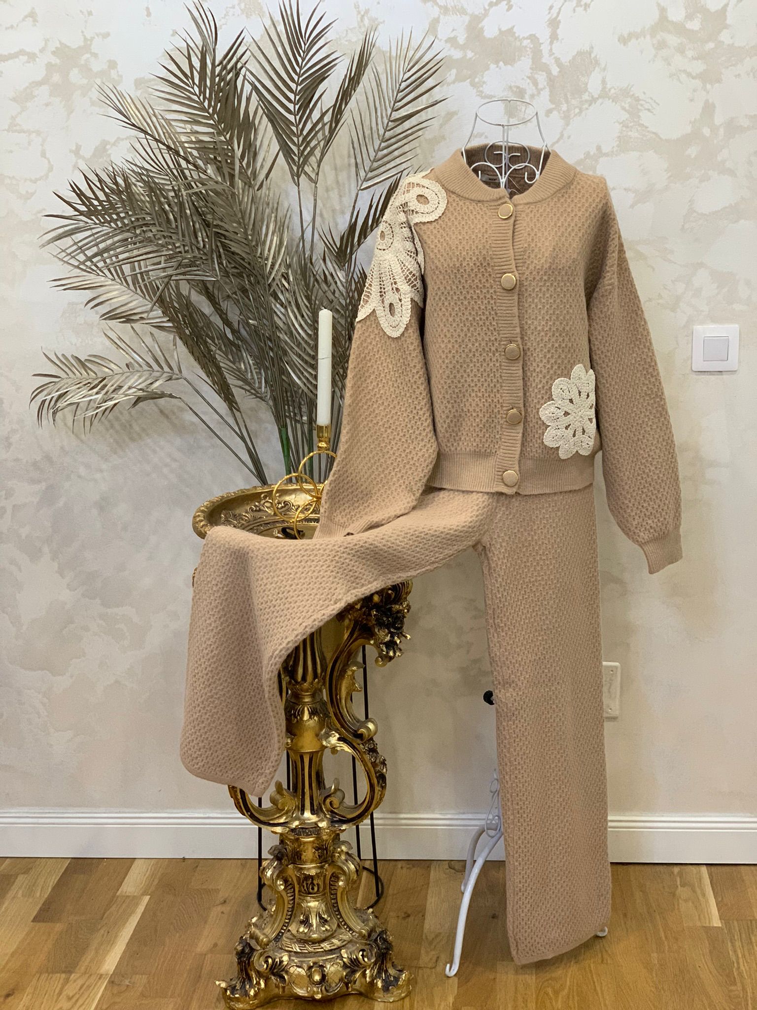 Compleu tricotat din două piese, format din cardigan cu nasturi și pantaloni lungi, lejeri. Materialul este moale, plăcut la atingere, cu textură fină tip fagure, oferind o notă elegantă și cozy. Cardiganul este decorat cu aplicații florale croșetate, care adaugă un detaliu feminin și delicat.