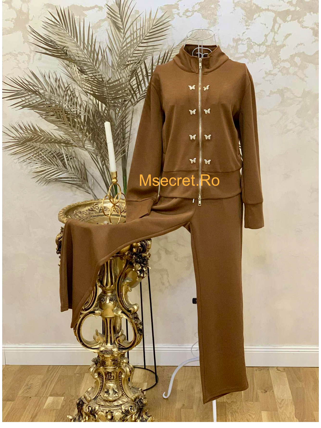 Un compleu din bumbac de calitate superioară, moale și plăcut la atingere, ideal pentru zilele relaxate în care vrei să arăți impecabil fără efort. Bluza are un design modern, cu fermoar și detalii rafinate tip fluture metalic, iar pantalonii cu talie elastică oferă libertate totală de mișcare.