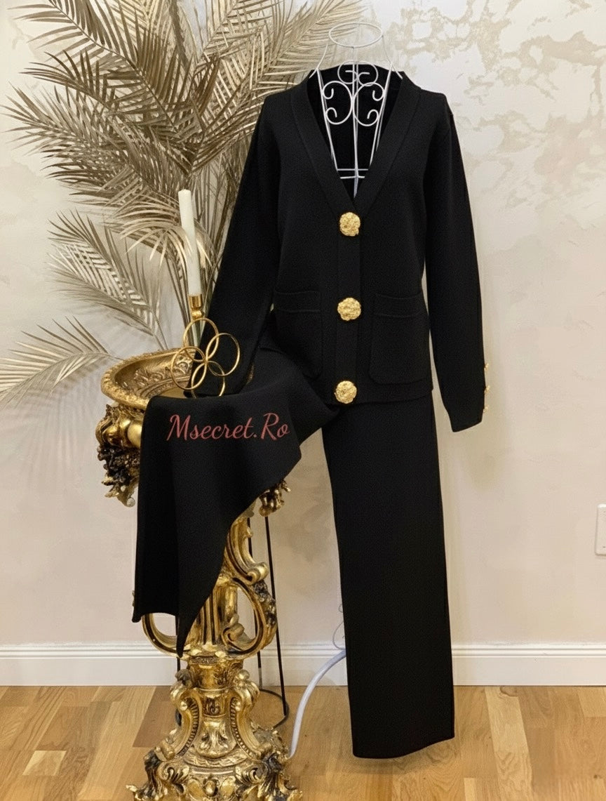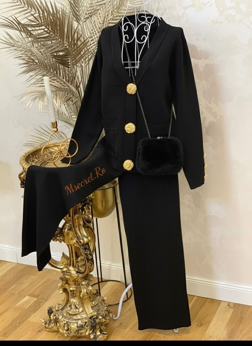Acest compleu elegant oferă un stil modern și sofisticat, ideal pentru ocazii speciale sau pentru a adăuga un plus de rafinament garderobei tale. Confecționat dintr-un material confortabil și moale, setul include un sacou cu croială lejeră, buzunare practice și nasturi statement aurii, care atrag atenția și adaugă un element de lux. Pantalonii cu croială dreaptă completează perfect look-ul, oferind un echilibru între confort și eleganță. Ideal pentru a fi purtat atât la birou, cât și la evenimente casual-chic.