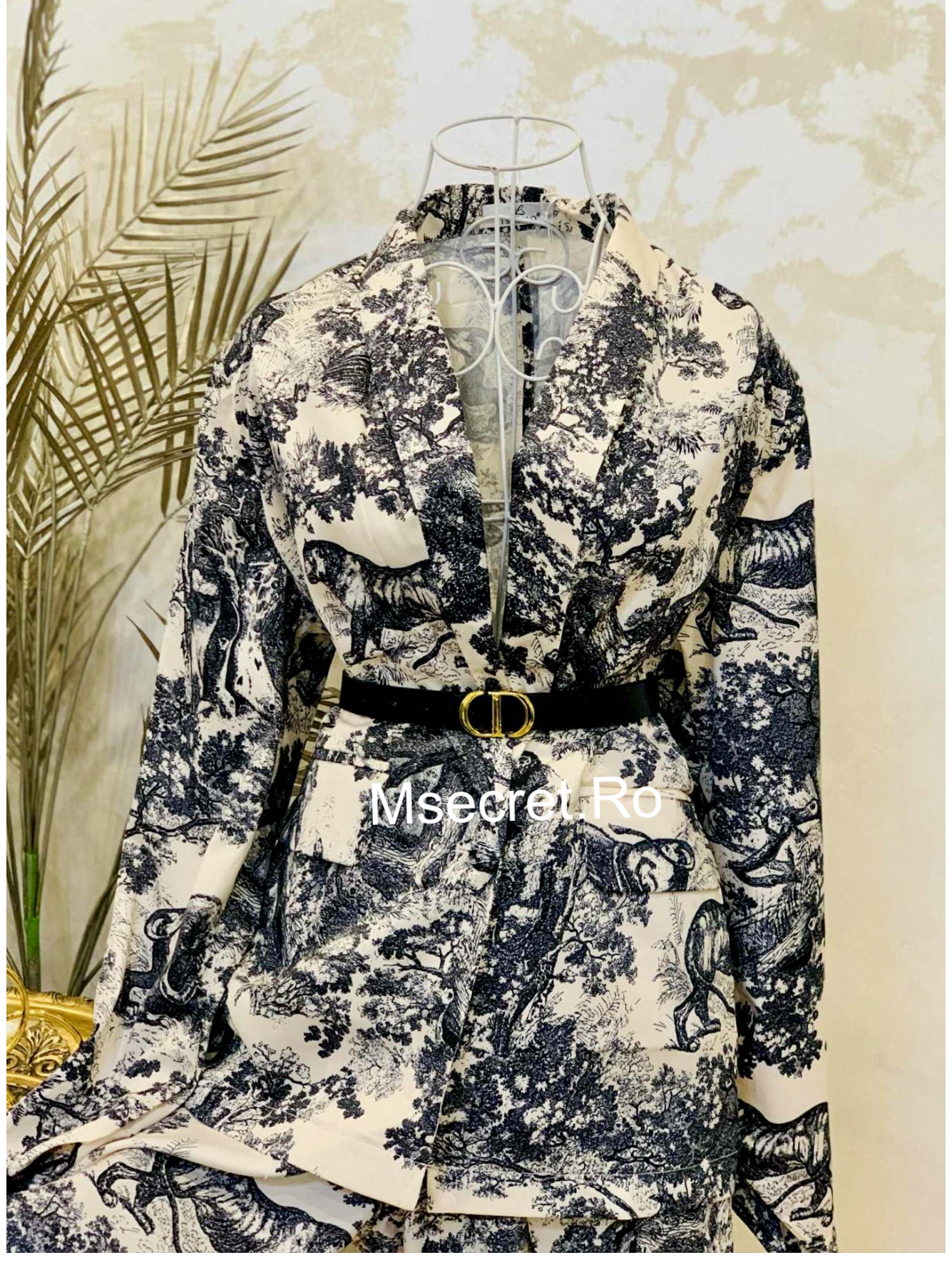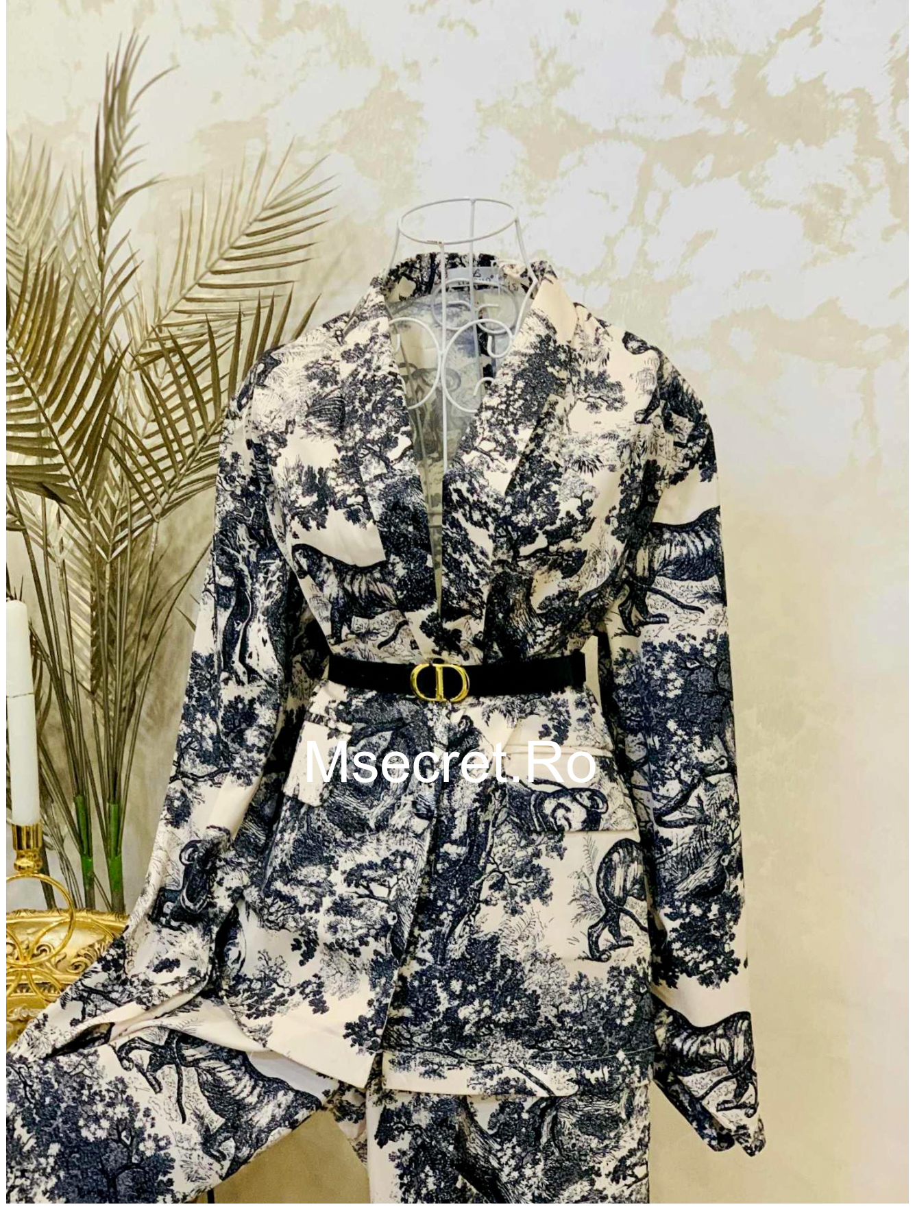 Un compleu satinat spectaculos, compus din sacou cu croi lejer și pantaloni largi, ce se remarcă prin imprimeul artistic în nuanțe de alb si albastru. Materialul satinat îi conferă un aer luxos șifluid. Este alegerea perfectă pentru femeia modernă care își dorește un outfit sofisticat și versatil, potrivit atât pentru evenimente de zi, cât și pentru seri elegante.