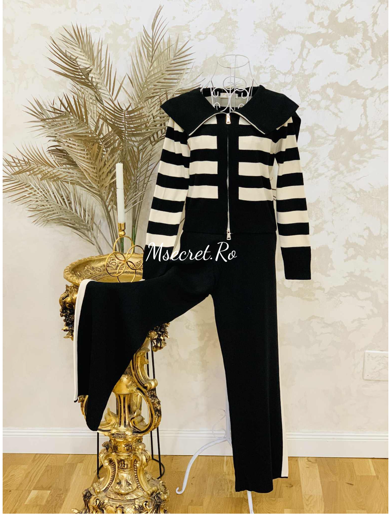 Compleu tricot alb-negru cu pantaloni lungi