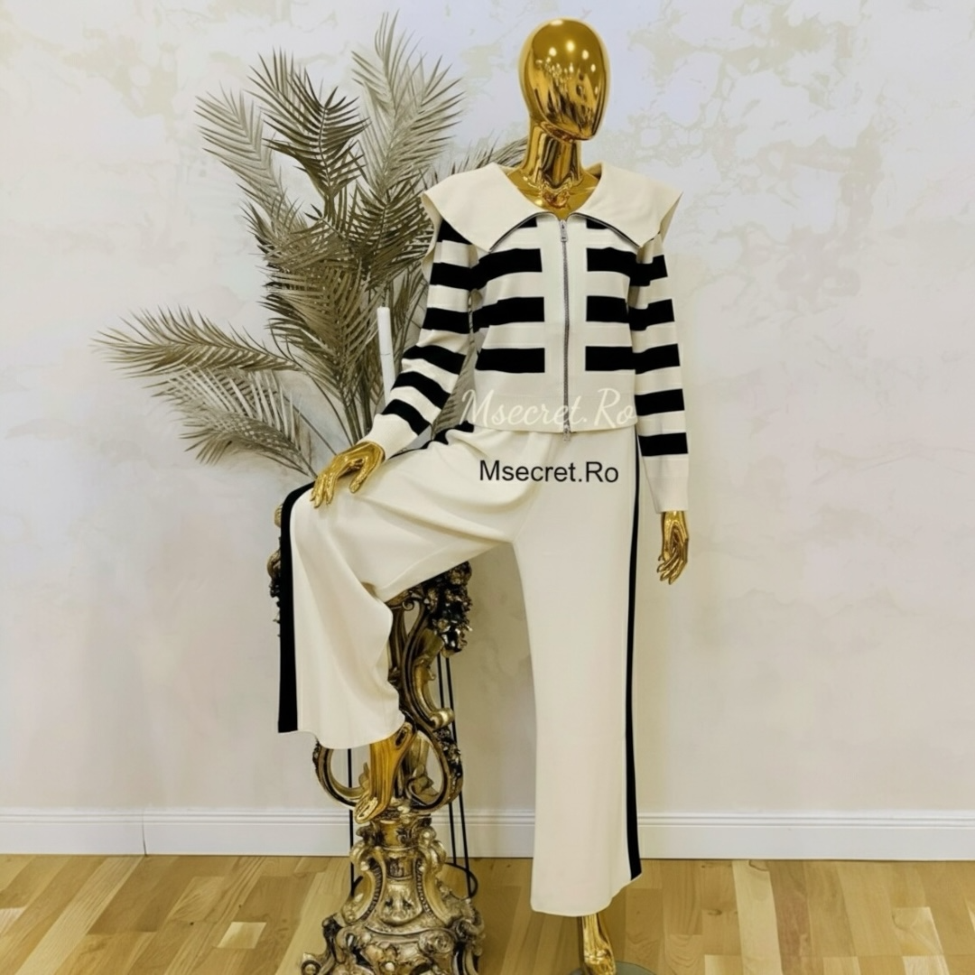- jacheta are dungi bej-negru, croi lejer și guler amplu tip sailor;