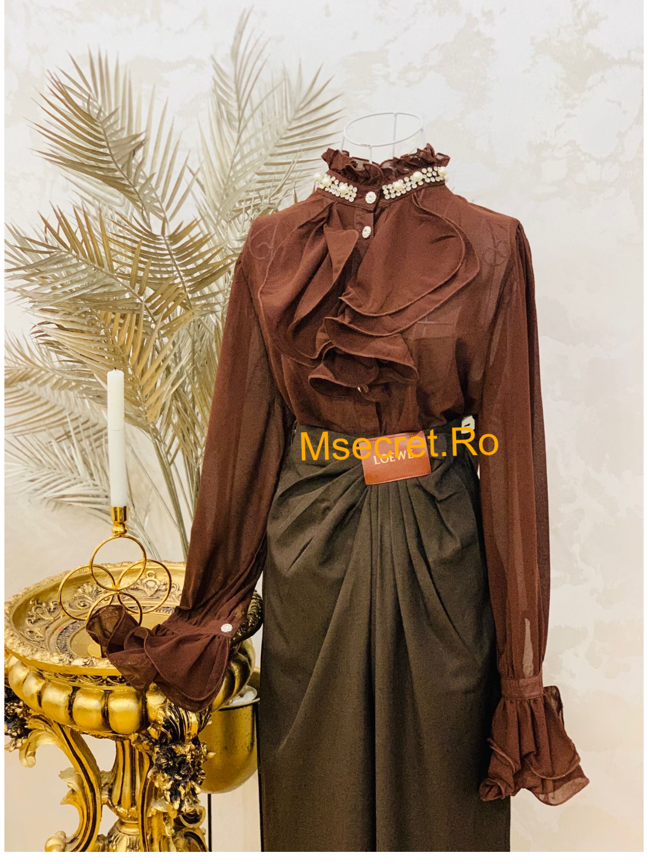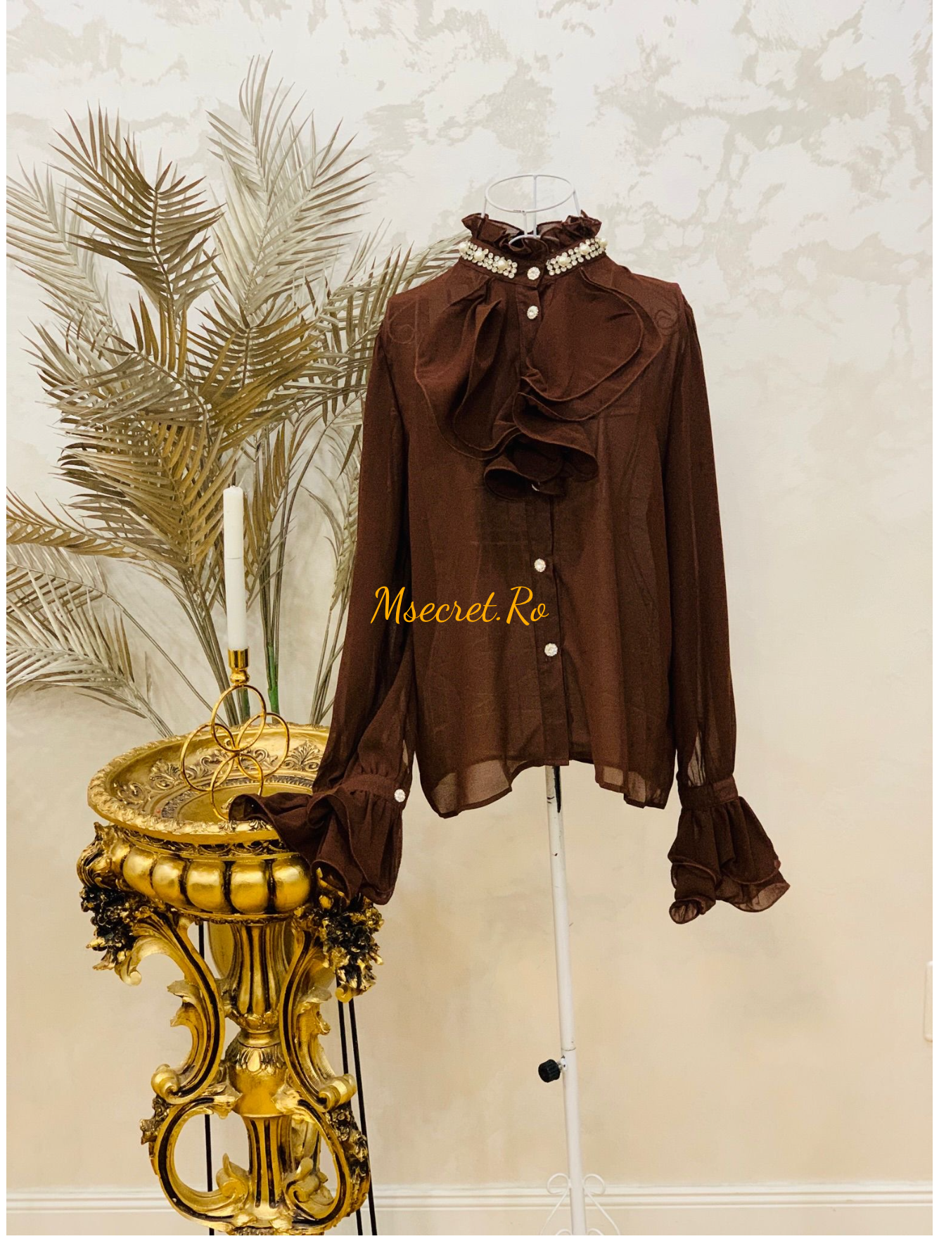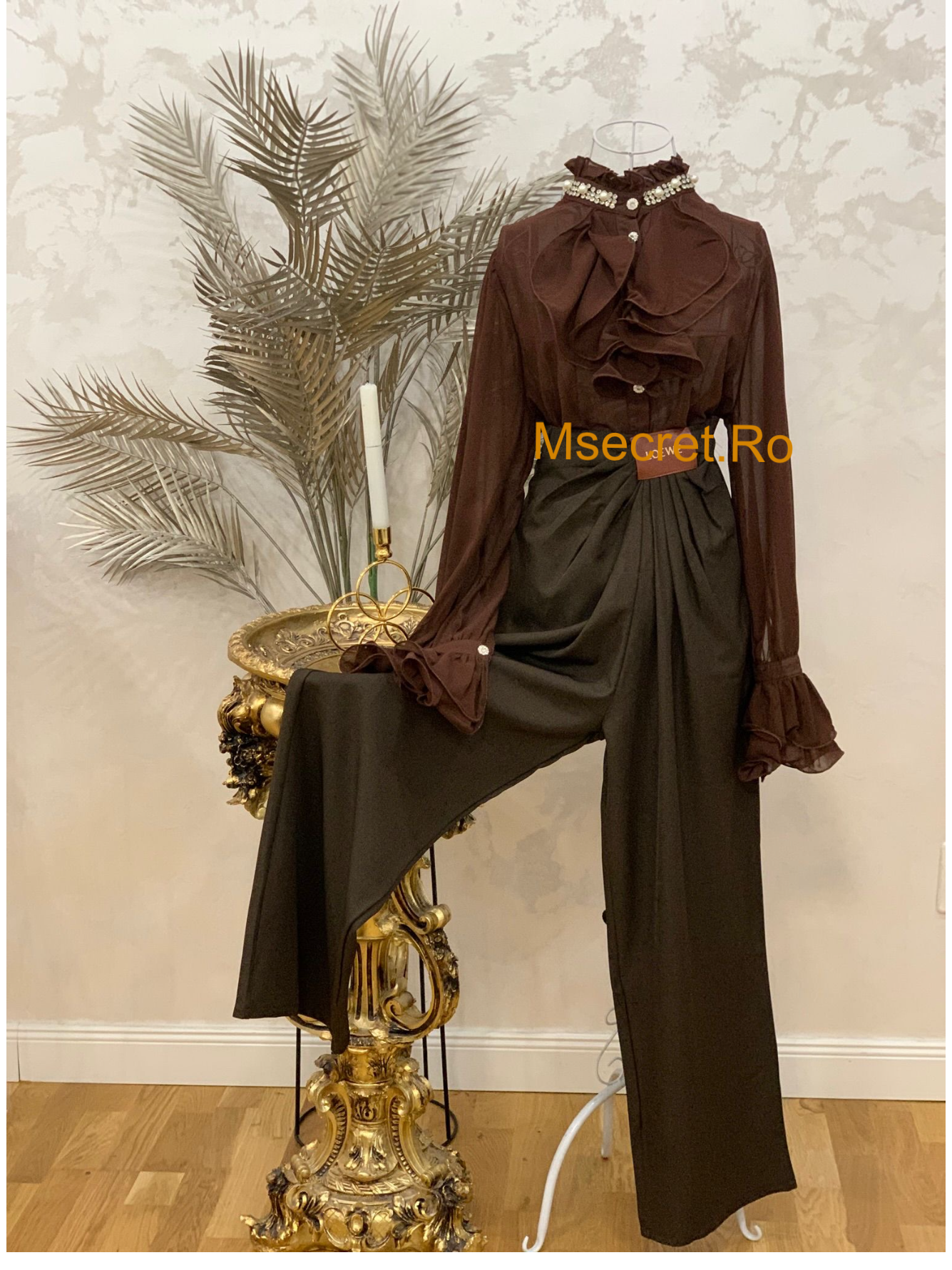 - • Prezintă volane pe piept, oferind un aer feminin și sofisticat.