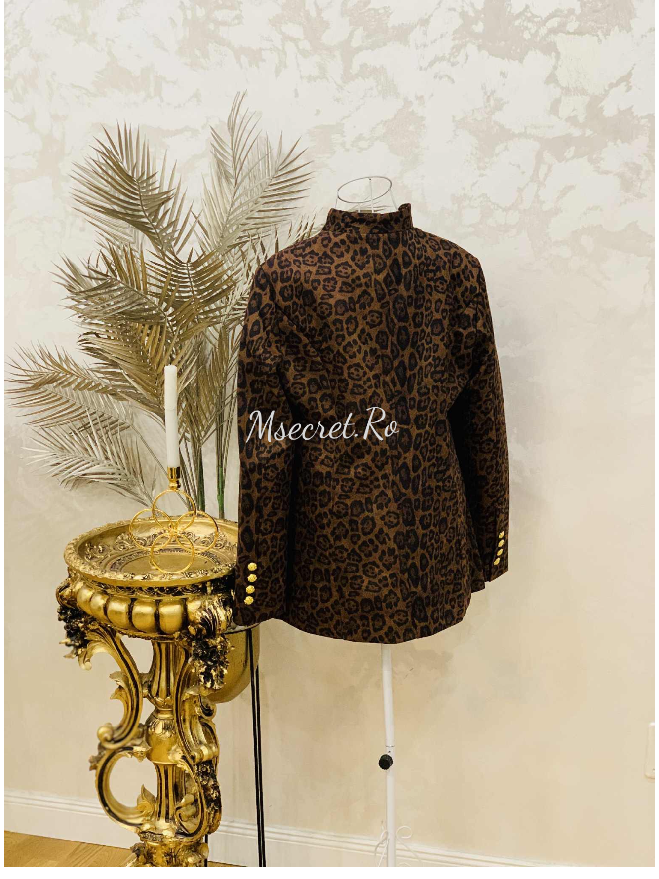 Geaca lunga animal print cu gluga, guler de blana naturala